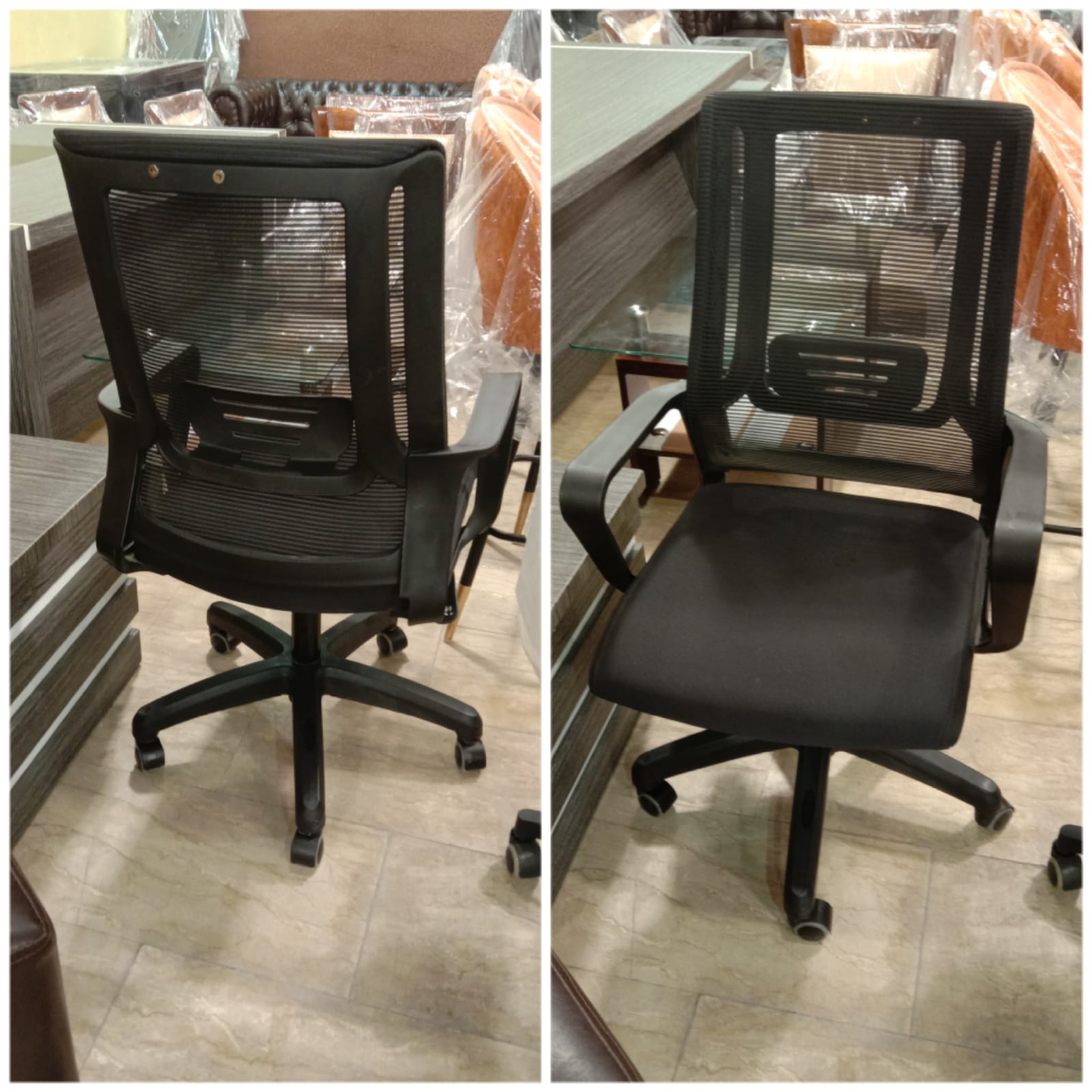 Staff Chair – Ready to use End to End Imported Chair, fitted with imported mesh, cushion, having imported motor underneath, fitted over class 3 cylinder, gripped into imported wheel base with imported wheels.