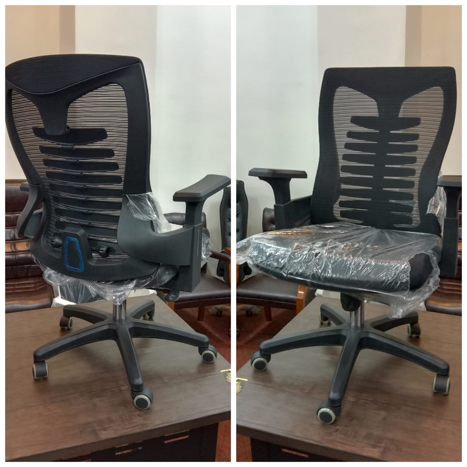Staff Chair – Ready to use End to End Imported Chair, fitted with imported mesh, cushion, having imported motor underneath, fitted over class 3 cylinder, gripped into imported wheel base with imported wheels.