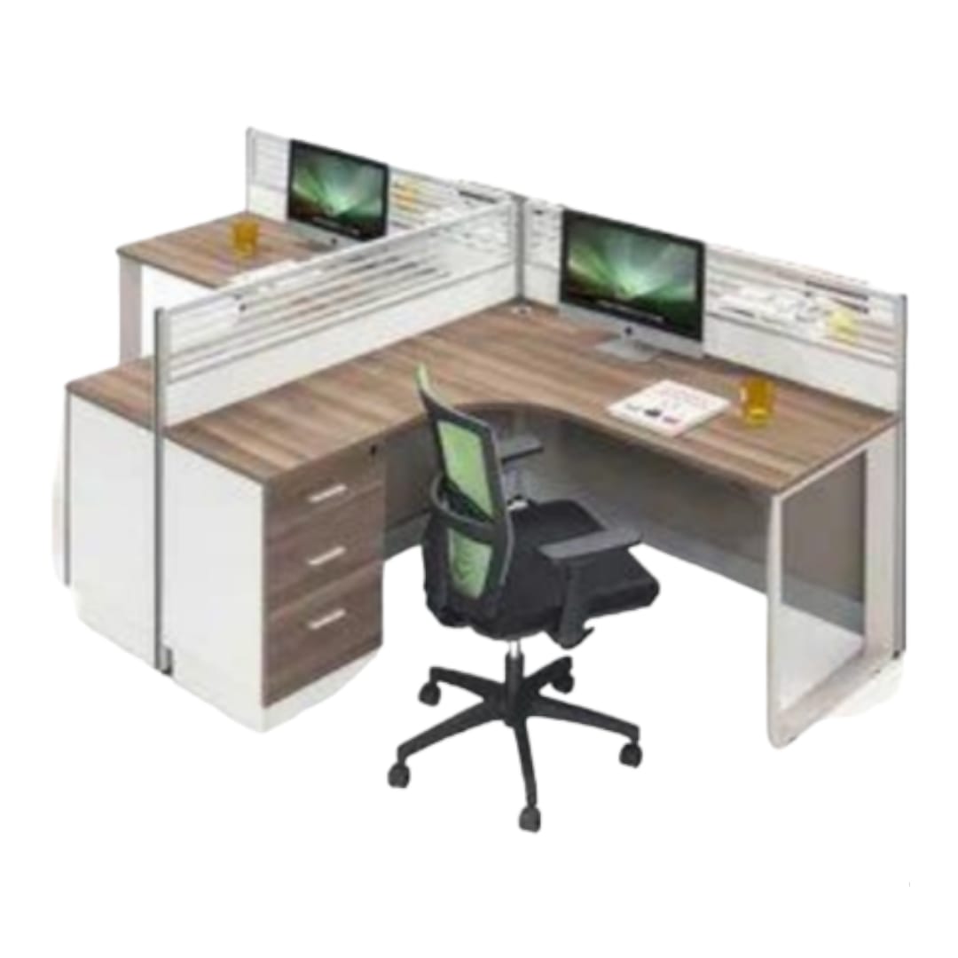 Two (2) Person Workstation (with external drawer units) – Make to order, customized as per design and size, tabletop made in MDF Lamination (Matte, Tactile, High Gloss) 32mm composite, having imported PVC edging all around along with partitions (aluminum framed glass) with permanent fitting, alongside plastic wire caps assembled over 18 gauge Metal Frame base (MS Prime Pipe – 1″ x 2″) with powder coating finish. Drawer units (2), having (3) drawers running over imported drawer channels, fitted with imported drawer handles with provision of locks.