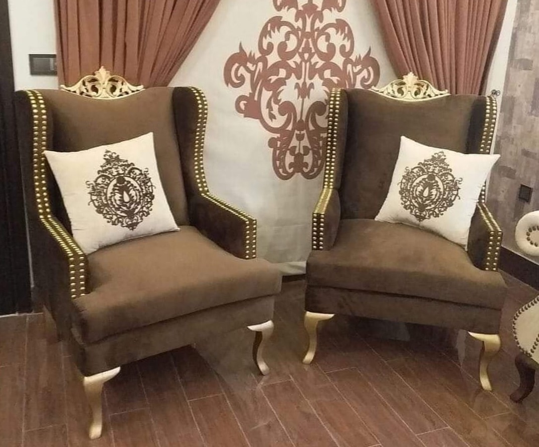 Wing Chairs – Make to order, customized as per design and size, made in 1“ by 1“ wooden structure, filled up with top quality molty foam all around and (leatherite, jute, velvet) finish on top with 5 year structure and foam warranty.